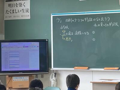タブレットでグラフを操作して、自分の考えをスプレッドシートに入力し、みんなでお互いの考えを交流し合う授業でした。一人一人が一生懸命考え、自分の考えを交流の中で深めることができました。
