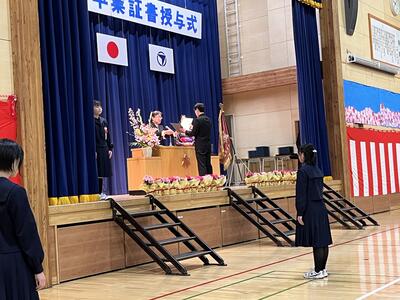 今年度は、吹奏楽部の演奏で卒業生は入退場することができました。また、保護者の皆様や来賓の皆様の目の前で在校生合唱「旅立ちの日に」卒業生合唱「友」を披露しました。歌声は体育館いっぱいに響き渡り、「合唱の西中」として伝統をつないできた感動的な歌を最後も聞かせてくれました。