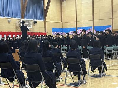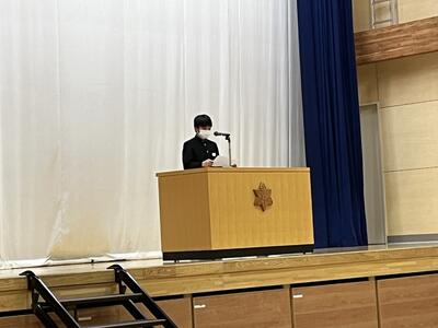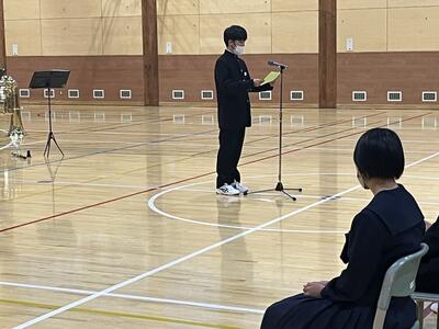 始業式では、生徒代表として生徒会副会長土屋さん、2学年代表田口さん、3学年代表大橋さんが「新学年の抱負」を発表しました。