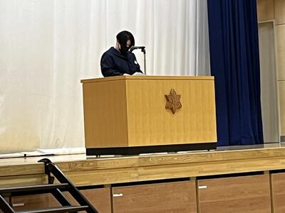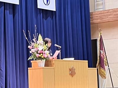 4月5日(金)、8名の教職員の着任式を行い、生徒代表歓迎の言葉を四ツ嶋さんが発表しました。