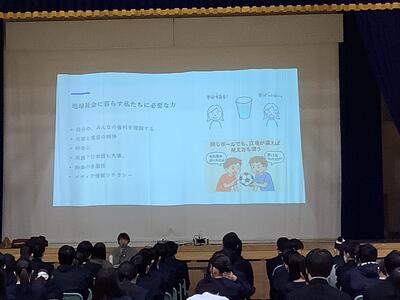 最後に3年生へ向けて、①自分やみんなの権利を理解すること、②共感と寛容の精神、③好奇心を持つこと、④英語はもちろん日本語も大切にすること、⑤物事を多面的に見ること、⑥メディア情報リテラシーを高めること、の6つのポイントを示してくださいました。 国際理解に関する内容でしたが、人との関わりや、相手を知ろうとする姿勢の大切さにも触れられ、身近な人から地域、そして世界の人々へと視野を広げ、互いに理解し合う社会の大切さを考える機会となりました。